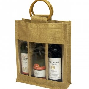 Best Seller! Pack of 5 x Jute Hessian Wine / Spirits 3 Bottle Gift Bags 36 x 28 x 10cm, with windows & cane handles Review